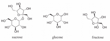 Figure 1: Chemical structures of sucrose (disaccharide) and its monosaccharide sugar components, glucose and fructose.
