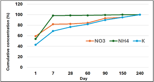 The measured nutrient (N and K) fraction released is presented cumulatively as a percentage of the total element released at the end of 240 days. Although N is present in both the nitrate (NO3) and ammonium (NH4) form, the nitrate fraction represents approximately 1% of the total N in NutriCAST™ (data not shown). Nitrogen is mostly in the ammonium (NH4) form, and nearly all of the ammonium is available for plant use within 28 days (Figure 1).
