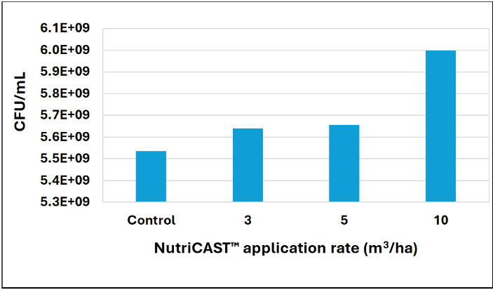 Figure 2: Relationship between NutriCAST™ application and the number of colony-forming units (CFU) per millilitre (ml) of rhizobia.